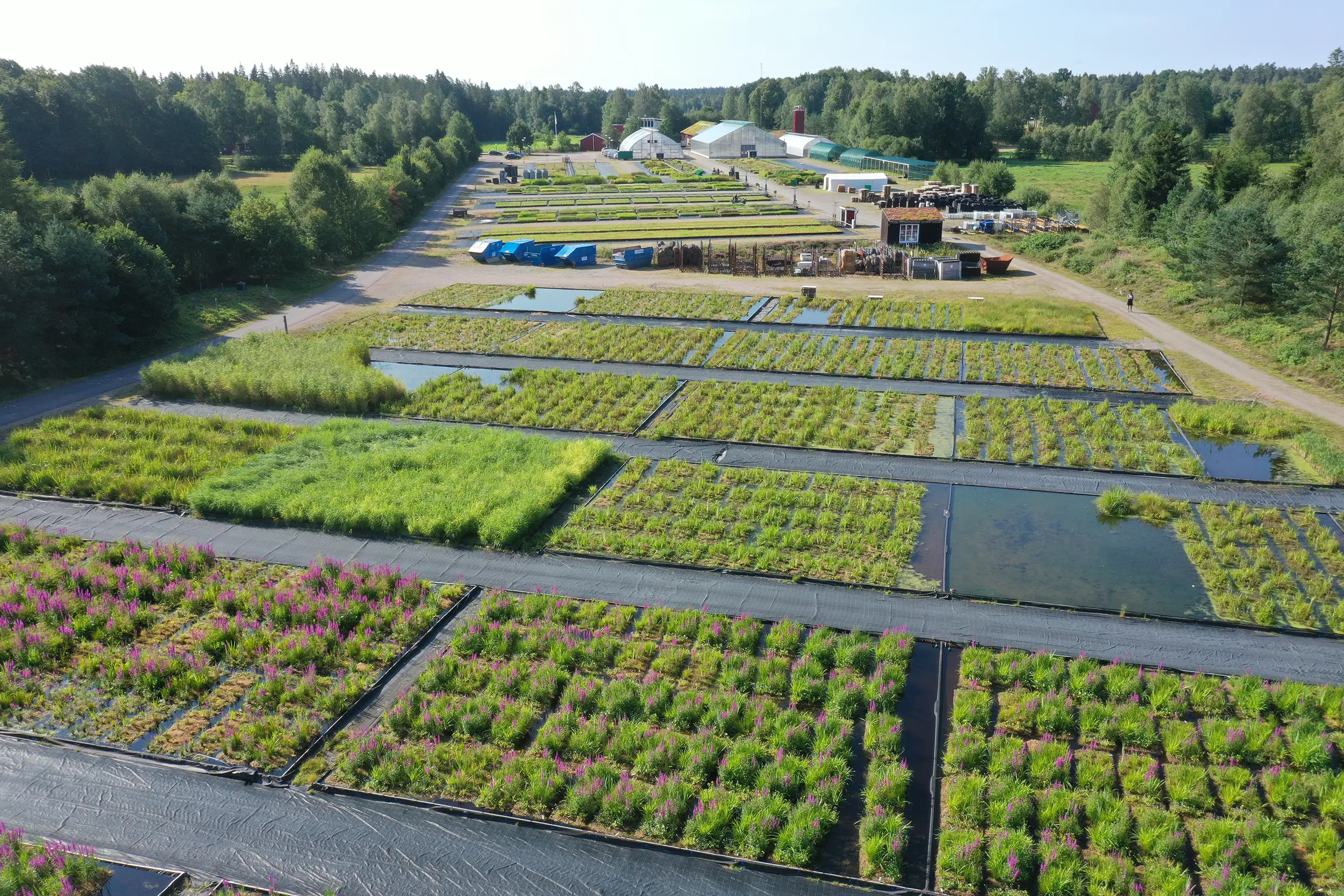 - Vi brukar säga att vi är bönder som använder en industriprocess för att odla Sedummattor av högsta kvalitet. Totalt har vi mer än åttahundratusen kvadratmeter odlingsytor och hela vår produktionskedja har vi byggt upp själva. Det gäller alltifrån en egenutvecklad maskinpark till vårt system för att pumpa ut vatten i exakt rätt mängder från våra dammar till att vi tar skott från befintliga växter att odla nya växter ifrån.